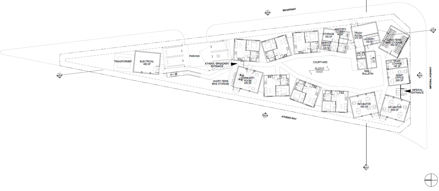 Two commercial spaces, each 450 square feet, are available with a shared restroom between them. These spaces are intended for community benefit organizations or small businesses serving low-income populations, in alignment with affordable housing financing requirements and subject to investor approval.